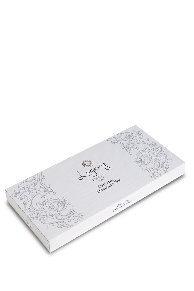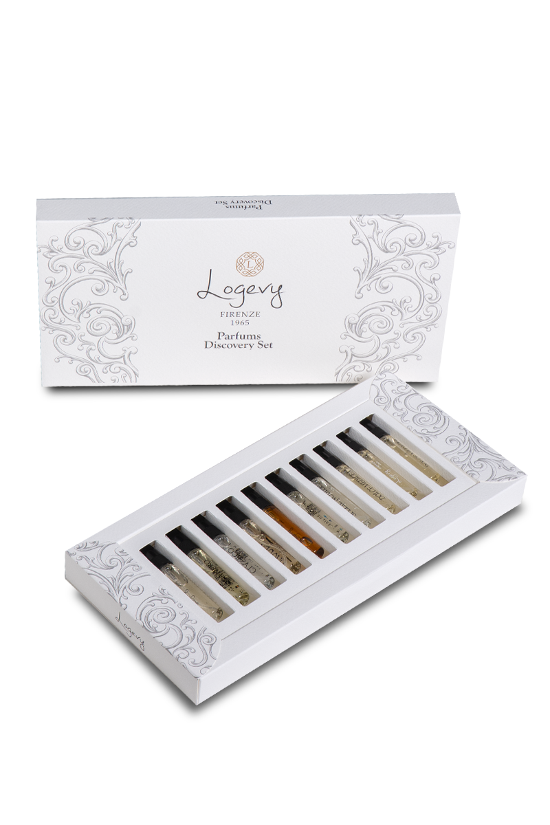 Il Cofanetto Logevy custodisce tutte le 10 referenze della collezione Battistero Parfum in comode fialette da 5ml, da 100 puf ciascuna.